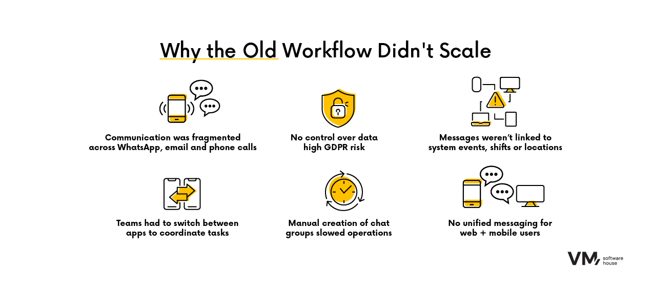 Ziel: Die operative Kommunikation zwischen Disponenten, Objektleitern und Mitarbeitenden zu vereinfachen – ohne externe Tools wie WhatsApp – und dabei volle DSGVO-Konformität sicherzustellen.