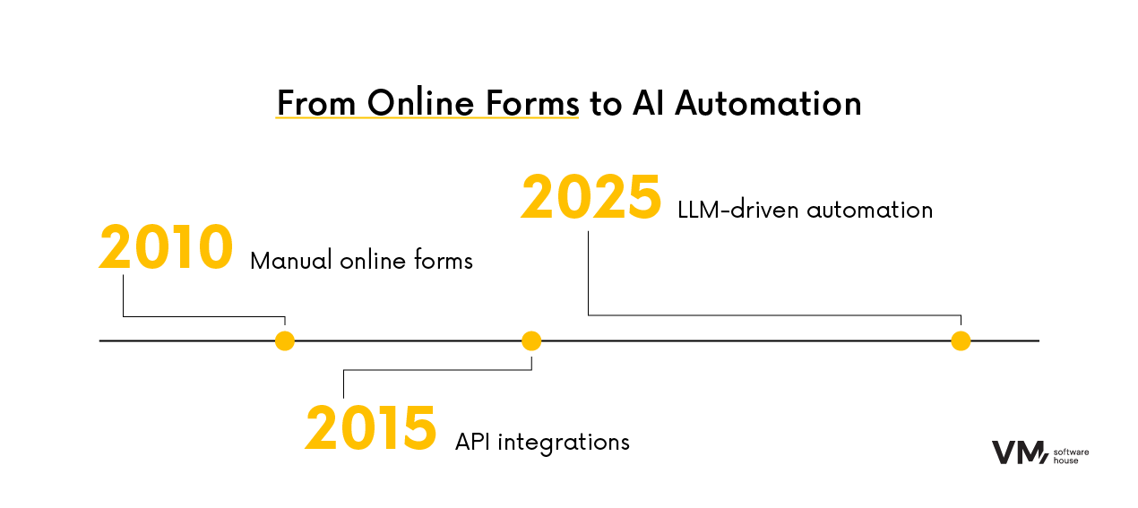 Hätte sich diese Herausforderung im Jahr 2010 gestellt, hätten wir ein Online-Formular vorgeschlagen, in das Kunden ihre Bestellungen manuell eingeben. Dies wäre ein erster Schritt zur Digitalisierung gewesen – und hätte die manuelle Übertragung aus E-Mails, PDFs und Scans überflüssig gemacht.