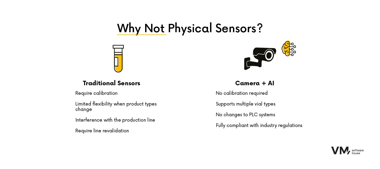 Die Produktionslinie litt unter häufigen Stillständen, verursacht durch umgestürzte Fläschchen auf dem Förderband. Betroffen waren sieben verschiedene Fläschchentypen – aus Glas und Kunststoff – mit Volumina zwischen 7 und 100 ml. Diese Produktvielfalt schloss den Einsatz klassischer physischer Sensoren aus, da diese eine aufwendige Kalibrierung erforderten und fehleranfällig waren.