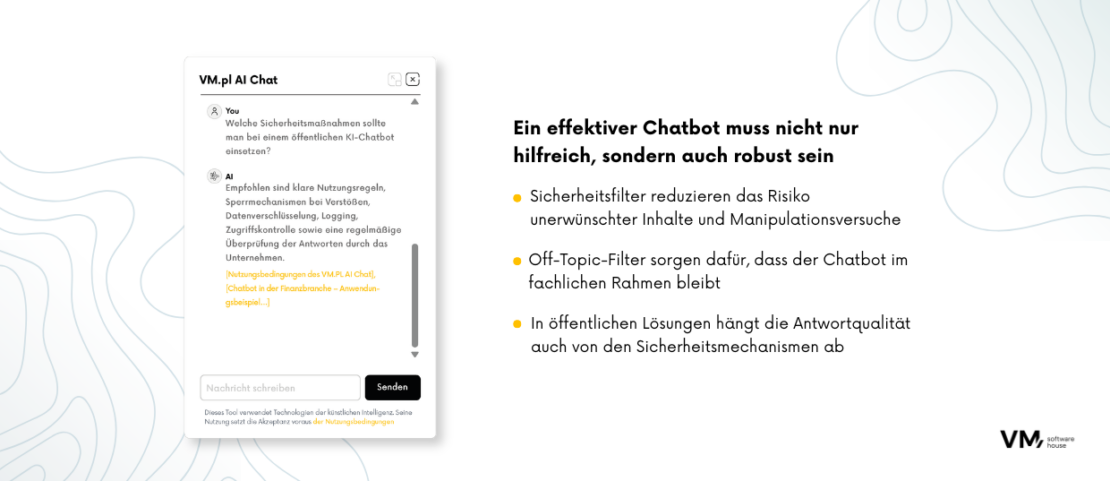 Die Absicherung eines Chatbots ist ein zentraler Bestandteil jeder KI-Implementierung. Es gibt kein universelles Regelwerk – jeder Bot erfordert einen individuellen Ansatz, abgestimmt auf seine Funktion, Branche und Zielgruppe. Ein Bot für externe Kunden braucht andere Filter als ein interner Assistent für IT-Mitarbeiter.