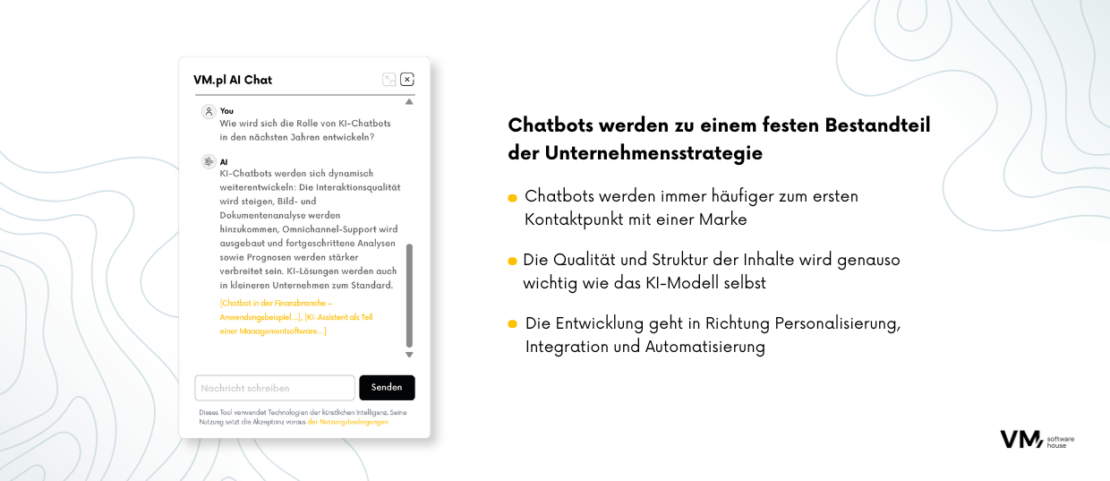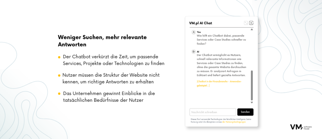 Bei der Entwicklung der Lösung war es uns wichtig, dass der Chatbot dem Nutzer nicht nur Informationen von der VM.pl-Website liefert, sondern auch Inhalte aus unseren externen Kanälen wie LinkedIn, wo wir Case Studies, Artikel und Informationen über unser Team veröffentlichen. So erhält der Nutzer kontextbezogene Antworten, kann schnell zu den Quellmaterialien wechseln und bekommt ein umfassenderes Bild unserer Arbeit und Kompetenzen.